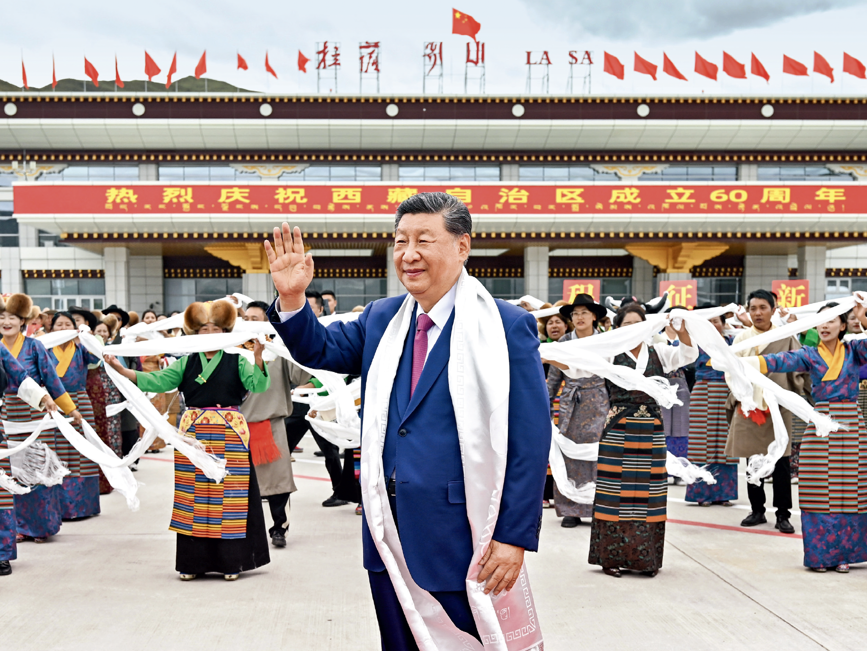 封面:习近平出席西藏自治区成立60周年庆祝活动 0 By lyw on 2025年10月1日 · 影像 8月20日中午,中共中央总书记、国家主席、中央军委主席习近平率中央代表团乘专机抵达拉萨,出席西藏自治区成立60周年庆祝活动。这是习近平向欢迎群众挥手致意。 (新华社记者 燕雁 摄) Visits: 0