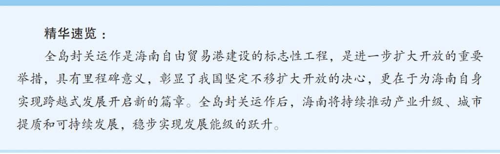 “封关运作”是海南自由贸易港建设的关键一步,其核心是将海南全岛设立为一个海关监管特殊区域,实行一套创新的管理模式,即“‘一线’放开、‘二线’ 管住、岛内自由”。2018 年4 月印发的《中共中央、国务院关于支持海南全面深化改革开放的指导意见》对海南建设分阶段提出了发展目标。其中,全岛封关运作是海南自贸港建设的标志性工程,是进一步扩大开放的重要举措,具有里程碑意义。