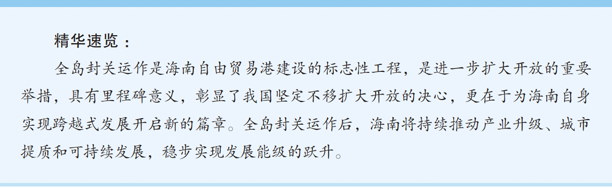 理解全岛封关运作的意义,需要从国家和海南自身两个维度来看。对国家而言, 海南自贸港在2025 年底实现全岛封关运作,表明中国已在海南这片土地上初步构建并实际验证了一套对标当今世界最高水平的开放型经济制度框架, 同时证明了这套框架在风险管控上是足够有效的。这更是中国向国际社会持续释放的一个明确信号:中国对外开放的决心坚定不移,对外开放的大门会越开越大。对海南自身而言,全岛封关运作时间节点的确定,首先是对过去五年海南在中央指导和支持下,努力推进软硬件基础设施建设、构建政策测试场景、明晰产业发展方向、培养和储备各类人才等工作的阶段性成果的肯定;更为关键的是,封关运作为海南下一阶段的发展提供了新的制度条件和历史机遇,使海南有机会在中国对外开放中扮演更有分量的角色。
